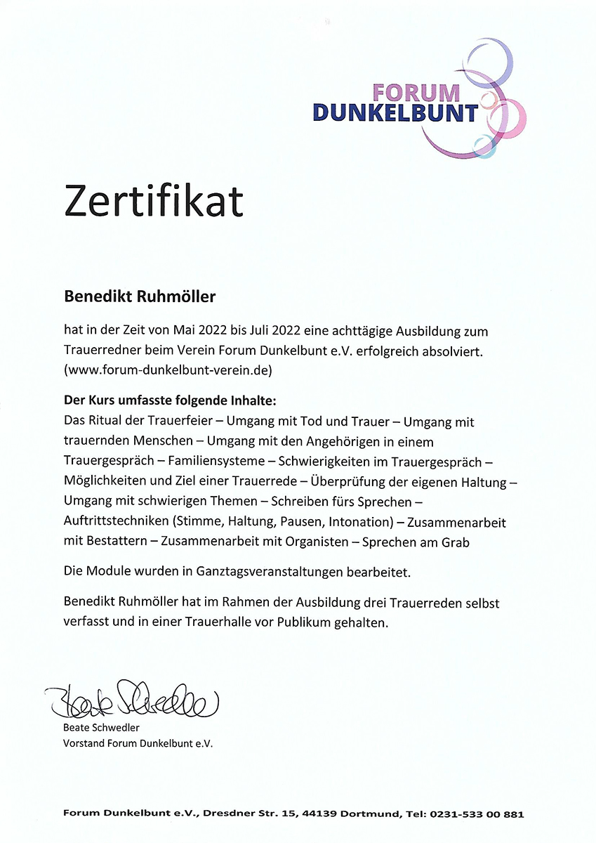 Für meine Tätigkeit als Trauerredner habe ich eine sehr qualifizierte und anspruchsvolle Ausbildung bei dem Verein „Forum Dunkelbunt e.V.“ in Dortmund absolviert und das Zertifikat für diese Qualifikation erworben.